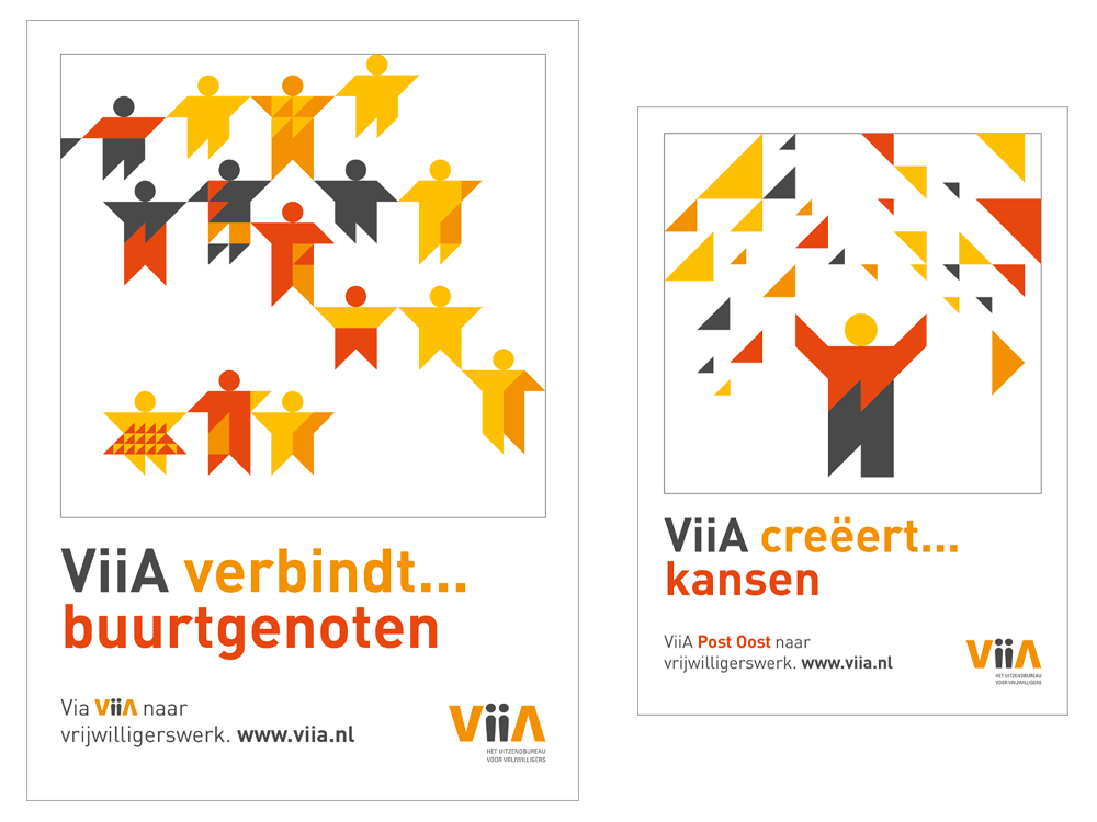 Voor de campagne hebben we 4 nieuwe kernwaarden geformuleerd die het nieuwe vrijwilligerswerk verwoorden. Deze kernwaarden zijn: VIIA verbindt buurtgenoten, VIIA prikkelt talenten, VIIA geeft energie, VIIA creƫert kansen. Deze waarden zijn samen met daarbij gemaakte illustraties toegepast op de verschillende uitingen van de campagne zoals posters, ballonnen, tasjes, pennen en stickers.