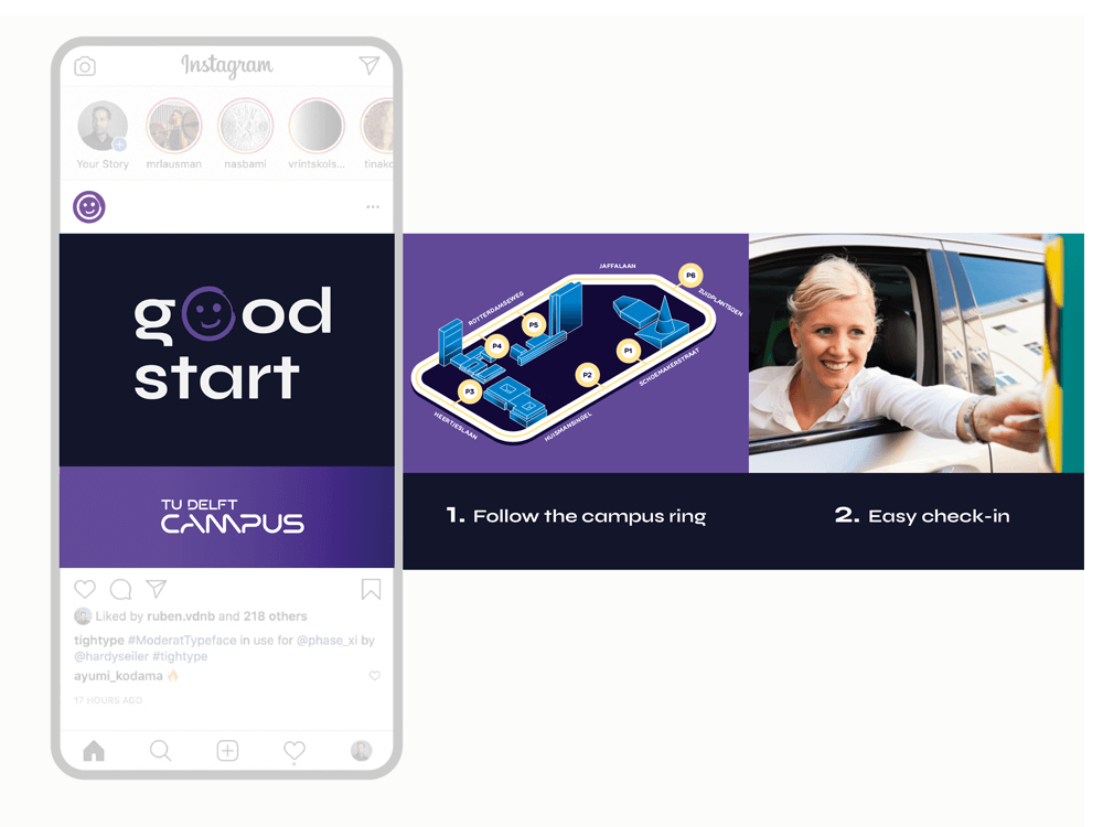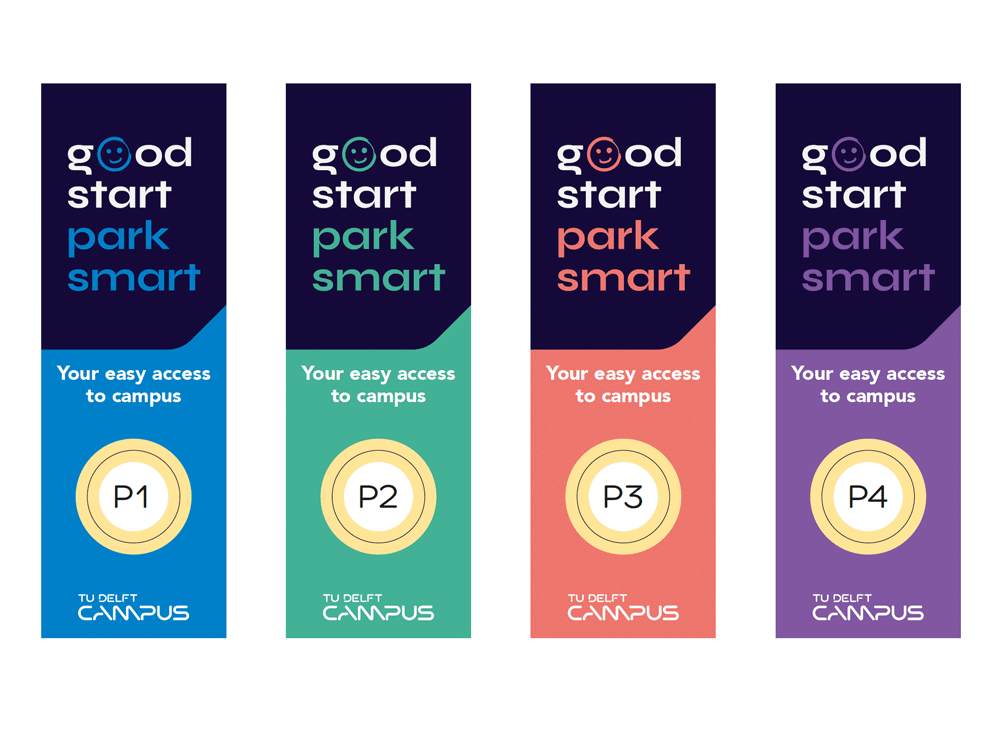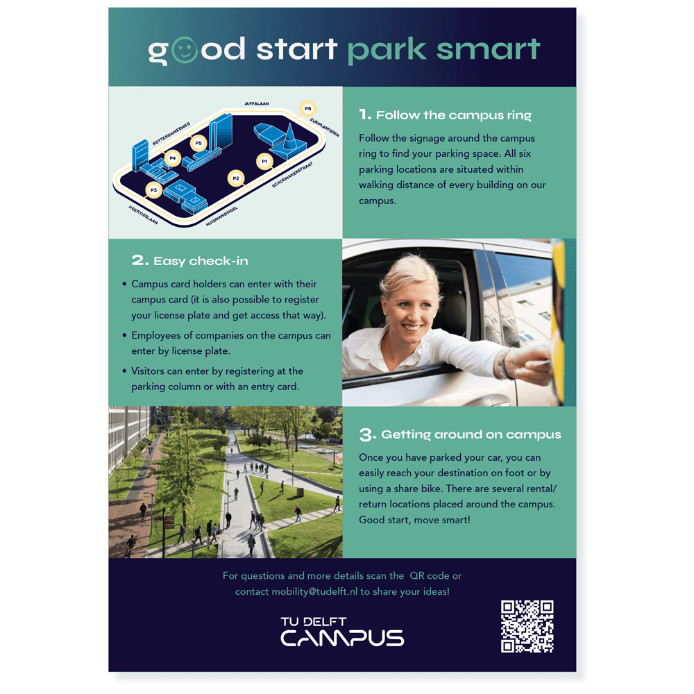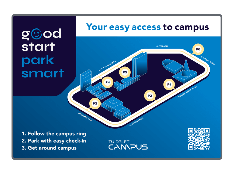 Samen ontwikkelden we de campagne Good Start, Park Smart: een communicatietraject dat zich over twee jaar uitstrekte en gebruikers stap voor stap meenam in de veranderingen. De basis werd een krachtige, overzichtelijke infographic met een herkenbaar uitgangspunt: een parkeerring rondom de campus. Deze ring is gebaseerd op een bestaande route rond TU Delft en werd het visuele anker waarvandaan alle parkeerlocaties logisch te vinden zijn.